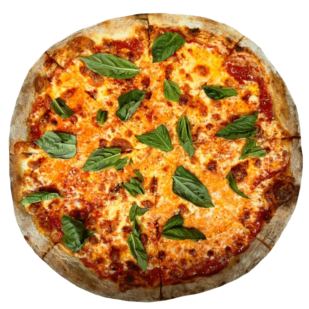 Notre grande classique : sauce tomate, mozzarella, basilic frais, origan, huile d’olive & une pincée de pecorino romano — simple, fraîche & parfaitement équilibrée.